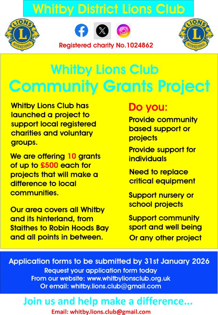 The Whitby District Lions Club is proud to announce the launch of our Community Grants Project, a new initiative aimed at supporting local registered charities and voluntary groups. Through this project, we are offering ten grants, each worth up to £500, to help fund projects that will have a positive and lasting impact on the local community. Our focus is on projects that can make a real difference to the people of Whitby and its surrounding areas. The geographical scope of the grants spans the entire Whitby district, covering the villages from Staithes to Robin Hood’s Bay, and all points in between. We encourage local organisations to apply and take advantage of this opportunity to receive funding that will enable them to make meaningful contributions to improve the lives of our local community and our areas wellbeing. Grants are available for the following purposes: